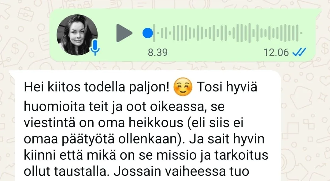 Voit tilata ilmaisen kevyen myynnin kehitysanalyysin, jossa kerron puhelimitse tai WhatsApp ääniviestillä havaitsemani puutteet ja kuinka lähtisin niitä korjaamaan.