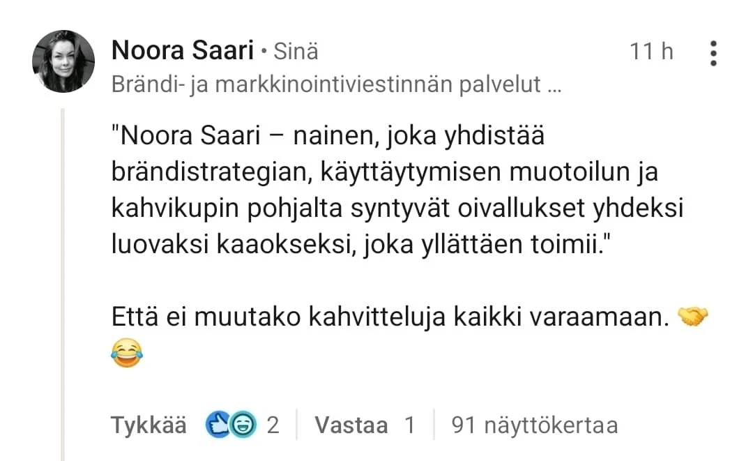 Rakastan nostaa esiin yrittäjien ajatuksia ja arvoja niin, että ne muuttuvat sanoiksi, kuviksi ja videoiksi, jotka koskettavat ja jäävät mieleen.